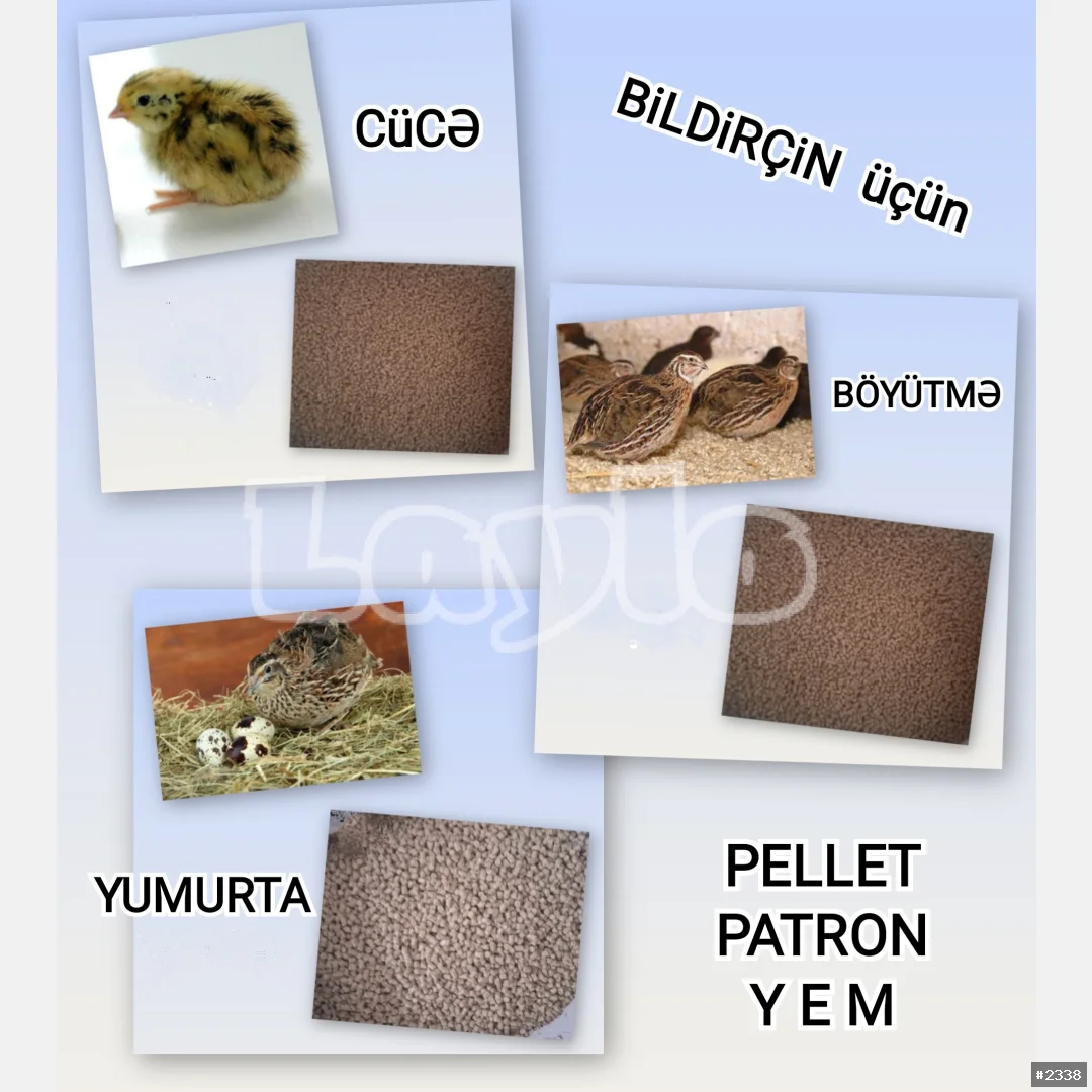 Bildirçin Yumurta PELLET Yemi. Yemin tərkibindəki kalsium və D vitamini yumurta qabığının möhkəm olmasını təmin edir. Yumurta sarısı rəngindəki pegmentasiya artımını dəstəkləyir. Mineral və amin turşuları, yağlı toxumlar və jmıxı, taxıl məhsulları, nişasta, kalsium, dikalsium fosfat, duz, enzimlər, kiflənmə əleyhinə antioksidantlardan hazırlanır. Protein 18%. Enerji 2700 Kkal. Kalsium: 3%. Çatdırılma PULSUZ Kisə ilə = 50 ₼.