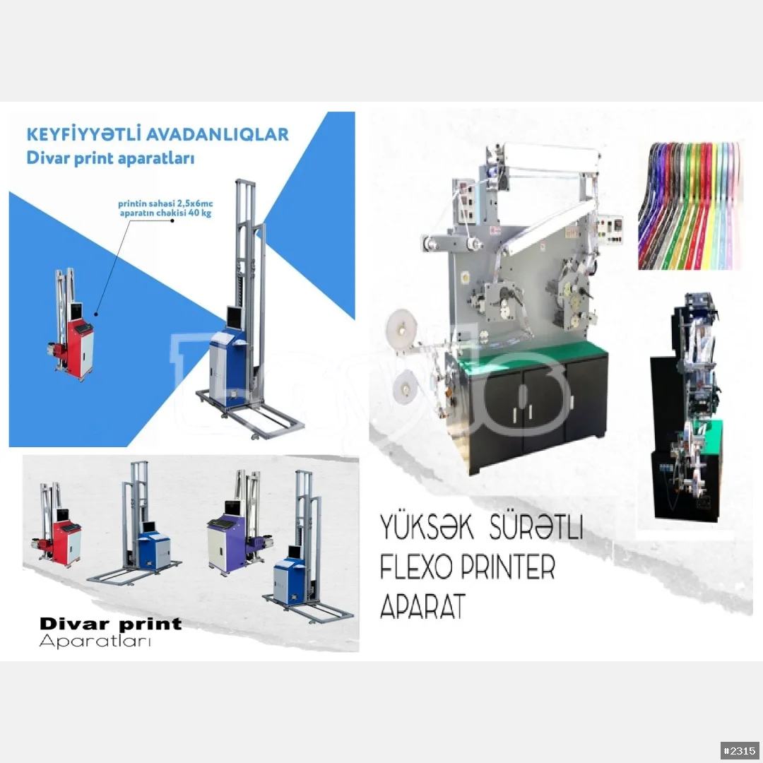 ● SÜRƏTLİ PRİNTER. Riband. Pambıq. Rezin, Neylon. Kağız və yapışan lent və digər materiallar üzərində çap işləri. Flexo printer vasitəsi ilə yüksək mənfəət əldə edə bilərsiniz. Avropa & ABŞ ətraf mühitin qorunması standartlarına cavab verir və zəhərsizdir. Sərbəst istifadə edilə bilər. Çap eni max: 150 mm. Min: 3 mm. Gücü: 4.7 Kw. 220V. Aparatın ölçüləri: 160*95*170 sm. Çəkisi: 600 kq. Qiyməti: 29.900 ₼. Printerlərin 1 il zəmanəti var