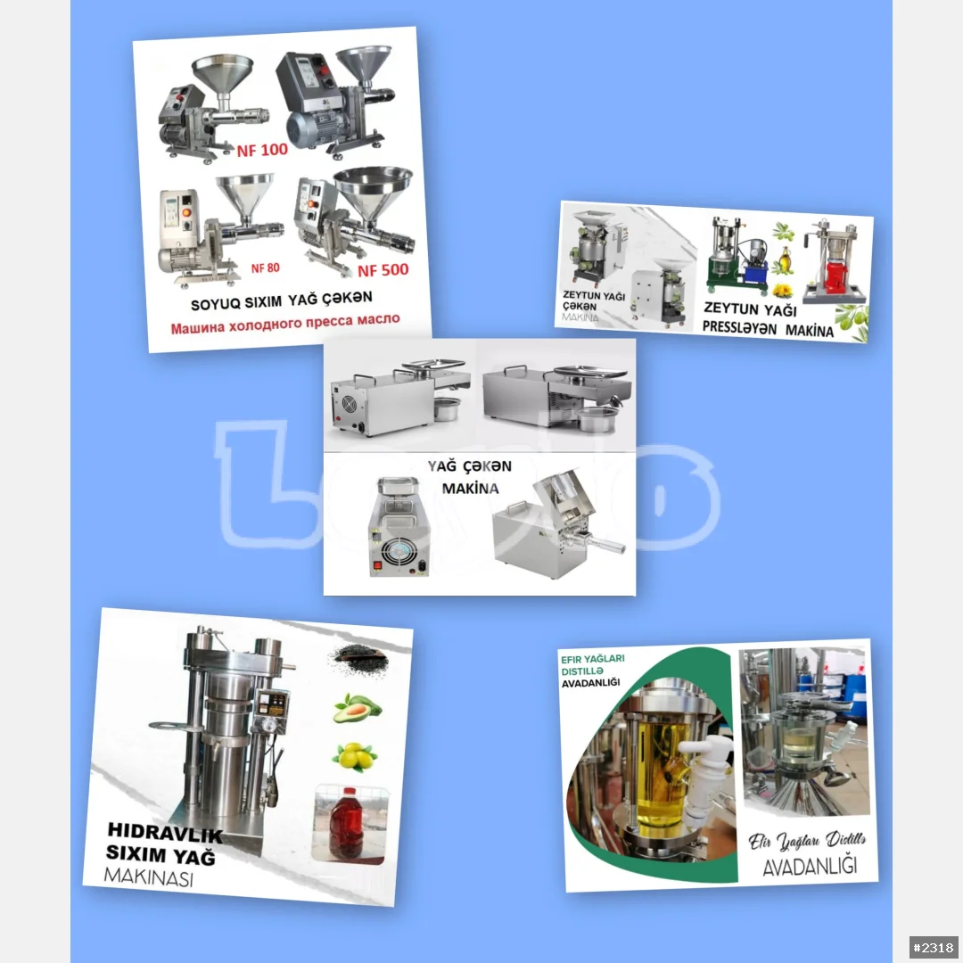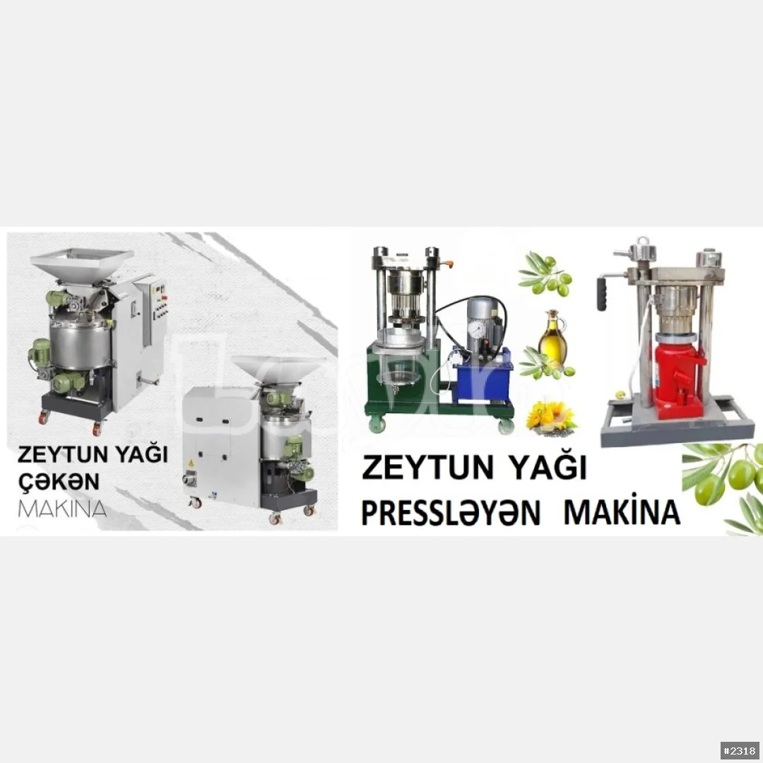 ● Zeytun Yağı çəkən makina. Təbii soyuq sıxım (Машина Оливкового масла холодного пресса). Türkiyə istehsalı. İdarəetmə paneli avtomatik. Çəkim gücü: 40-50 kq/saat. 380V. 6.23 Kw. Ölçüləri 84*165*155 sm. Çəkisi 420 kq. Material: Paslanmaz dəmir. Qiyməti: 29.900 ₼