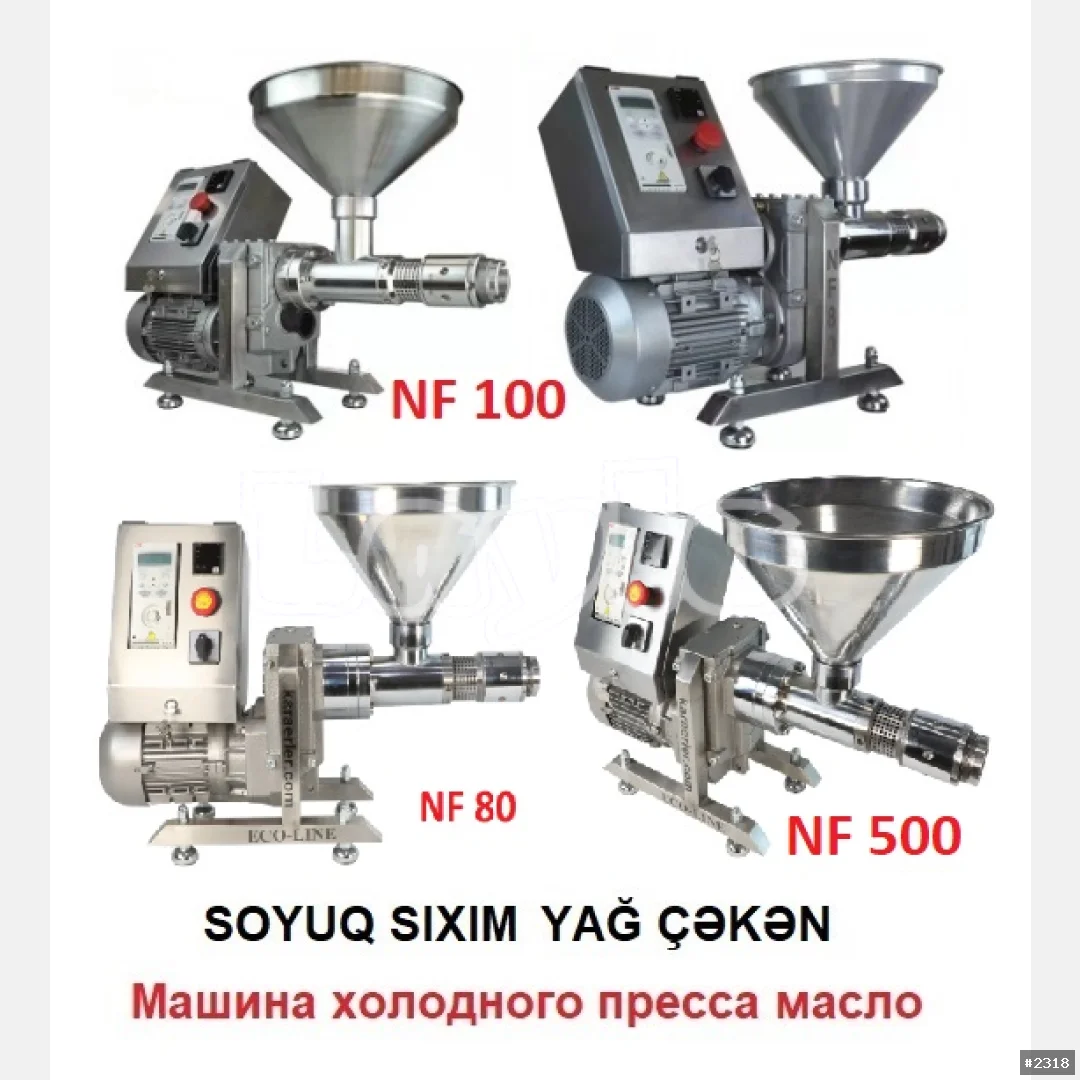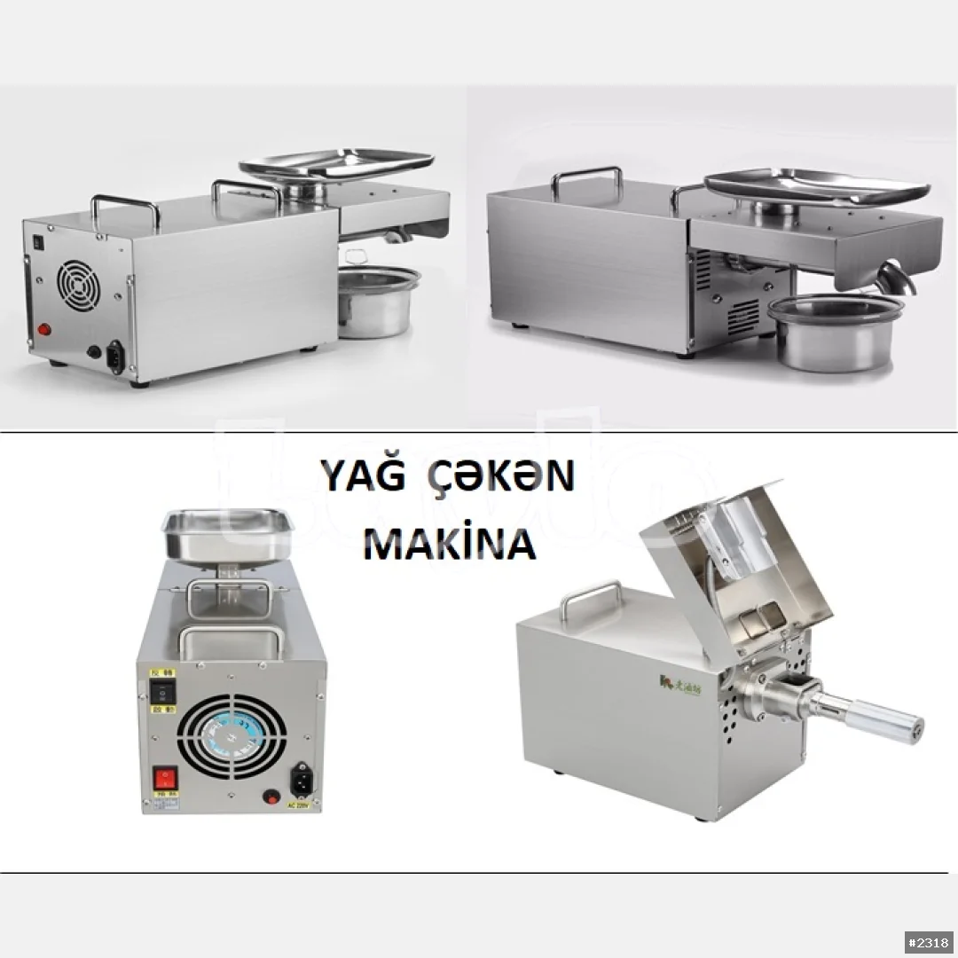 Yağçəkən. 4-6 kq/saatda (məhsuldan asılıdır). Kokos. Susam. Soya. Macadamiya fındığı. Qoz. Günəbaxan. Kətan. Qara cirə. Qarğıdalı. Küncüt. Zeytun (zeytunun çəyirdəyi çıxarılandan sonra) və s. yağları istehsal etmək üçün. Motoru sənaye tipli olduğu üçün 5 saatdan artıq işləyə bilir. Hər 5 saatdan bir 1 saat interval verilməlidir. Yağ istehsal etmə dərəcəsi 45% (toxumdan asılıdır) asan istifadə, təmizlənməsi, sökülməsi. Nəticələr: Araxis saatda 4 kq = 1.8 kq yağ. Günəbaxan tumu 4 kq/saatda = 1.8 kq yağ. Qoz 4.5 kq/saatda = 2.1 kq yağ. 220/110V. Gücü 650W. Material 304 paslanmaz dəmir. Ölçüləri 46*24*19 sm. Çəkisi 12 kq. Qiyməti: 650 ₼