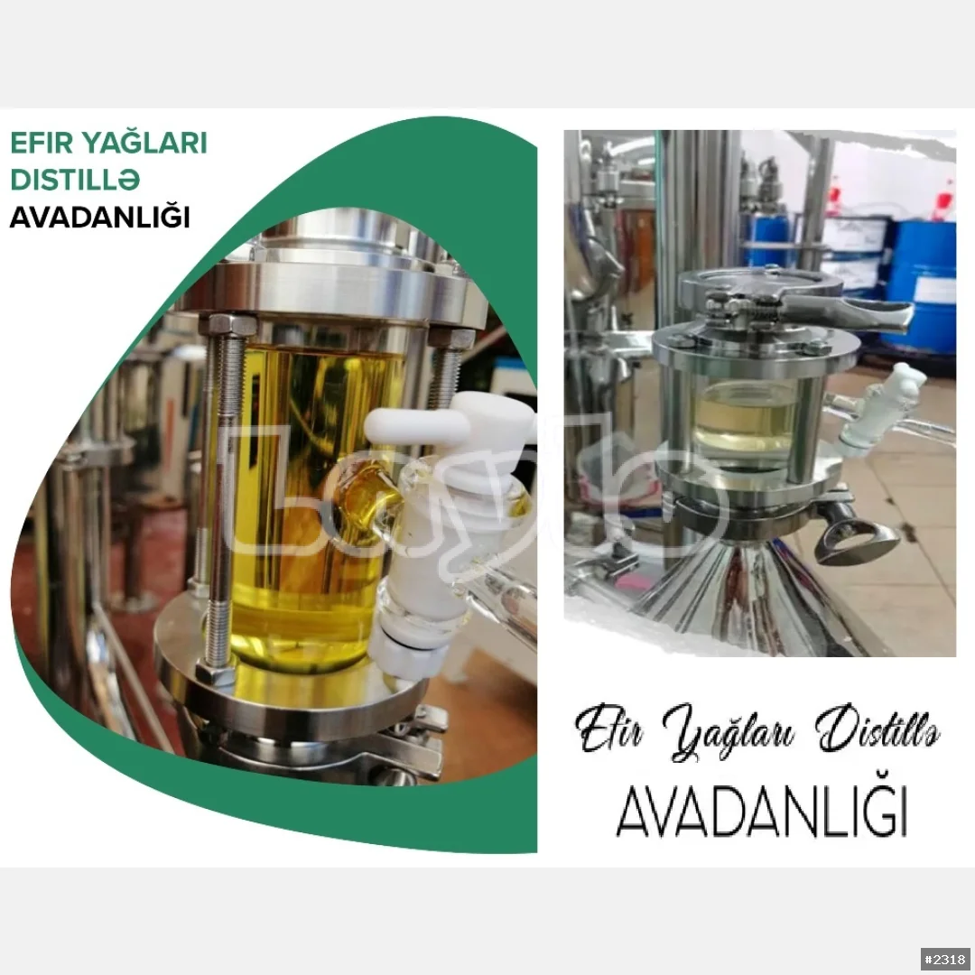 ● EFİR YAĞI DİSTİLLER. Bitki yağı çəkən maşın. Müxtəlif bitkilərdən efir yağı və hidrosalların istehsalı üçün. Bitki, çiçək, yarpaq və bitki budaqlarından yağ çəkmək üçün istifadə olunur. Çəkilən yağlardan Parfümeriya və Tibbdə geniş istifadə olunur. Cihaz damıtma qazan, material səbəti, izolyasiya təbəqəsi, ayırıcı, kondensat qülləsi, yağla suyu ayıran seperator, elektrik buxar qazanı və digər əlaqəli boruların kompozisiyasından ibarətdir. Qızdırıcı 6-9 Kw. 220V. 50 Hz. Qiyməti: 22.100 ₼