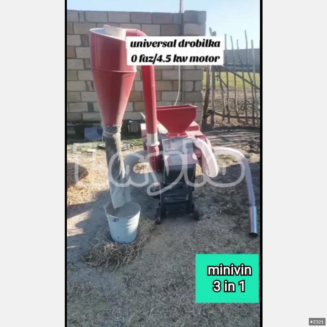 ● MİNİVİN. Ot və Yem üyüdən. Buğda. Arpa. Qarğıdalı. Taxıl. Saman. Yonca. Pambıq. Ot. Quru və Yaş. Pres. Maralfalfa. Qamış üyüdən. OT-Saman Saatda: 20 ədəd. Otu 2 cür iri və xırda formada üyüdür. YEM Saatda: 400-600 kq. Yemi 2 cür boru vasitəsi ilə avtomatik və mexaniki üstdən özünüz əlavə etməklə üyüdülür. 20 Bıçaqlı. 4 Baltalı. 220V. 4.5 Kw. Qiyməti: 2.550 ₼