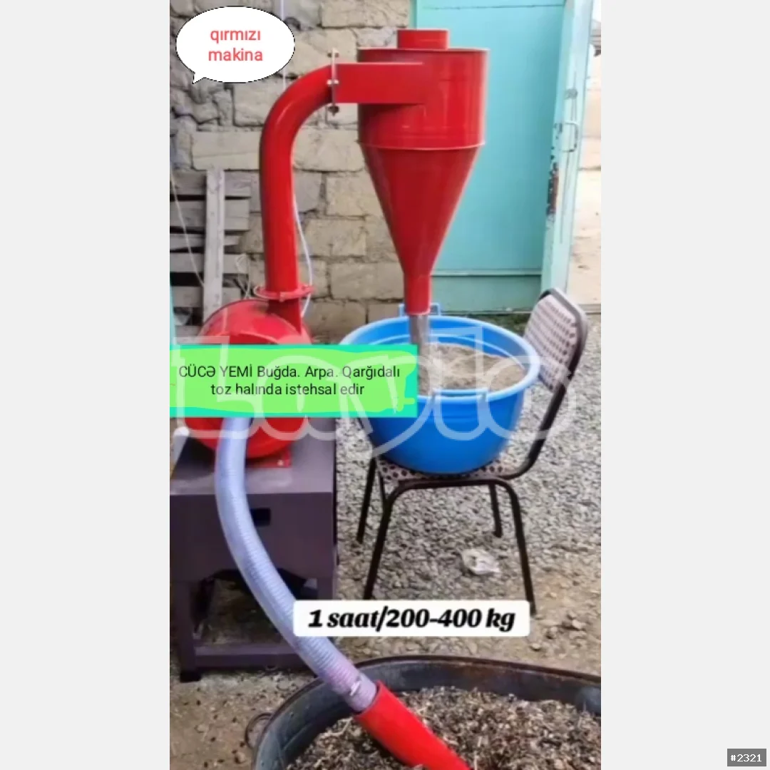 ● CÜCƏ YEMİ istehsal edən qırmızı makina. Buğda. Arpa. Qarğıdalı. Yem. Taxılı toz halında istehsal edir. Saatda 300-500 kq. 220V. 3 Kw. Qiyməti: 1.250 ₼