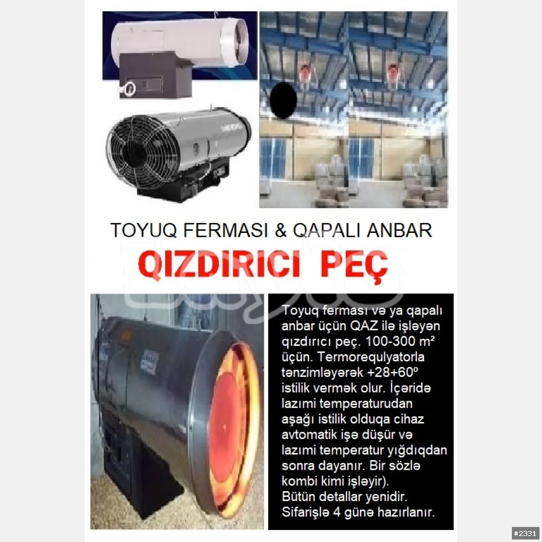 Qızdırıcı peç. Toyuq ferması və ya qapalı anbar üçün QAZ ilə işləyən qızdırıcı peç. 100-300 m² üçün. Termorequlyatorla tənzimləyərək +28+60⁰ istilik vermək olur. İçəridə lazımi temperaturudan aşağı istilik olduqa cihaz avtomatik işə düşür və lazımi temperatur yığdıqdan sonra dayanır. Bir sözlə kombi kimi işləyir). Toyuq ferması. Pranik. Avto boyama sexləri üçün əvəz olunmazdır. Bütün detallar yenidir. Sifarişlə 4 günə hazırlanır. Öncədən 50% beh alınır. Qiyməti: 750 ₼