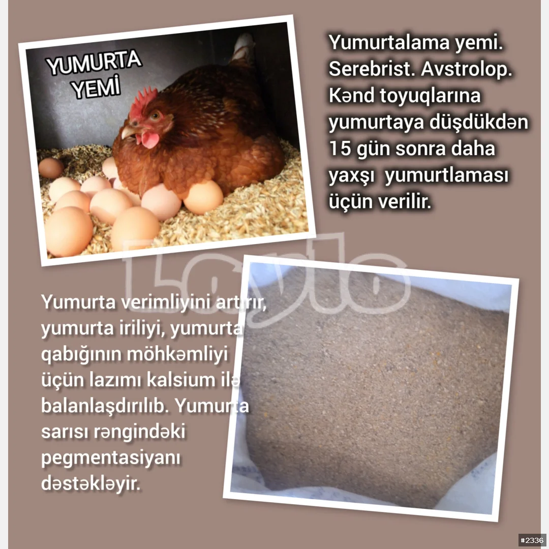 Yumurtalama yemi. Serebrist. Avstrolop. Kənd toyuqlarına yumurtaya düşdükdən 15 gün sonra daha yaxşı yumurtlaması üçün verilir. Yumurta verimliyini artırır, yumurta iriliyi, yumurta qabığının möhkəmliyi üçün lazımı kalsium, enerji və aminoturşular ilə balanlaşdırılıb. Yumurta sarısı rəngindəki pegmentasiyanı dəstəkləyir. Kisədə 50 kq = 50 ₼