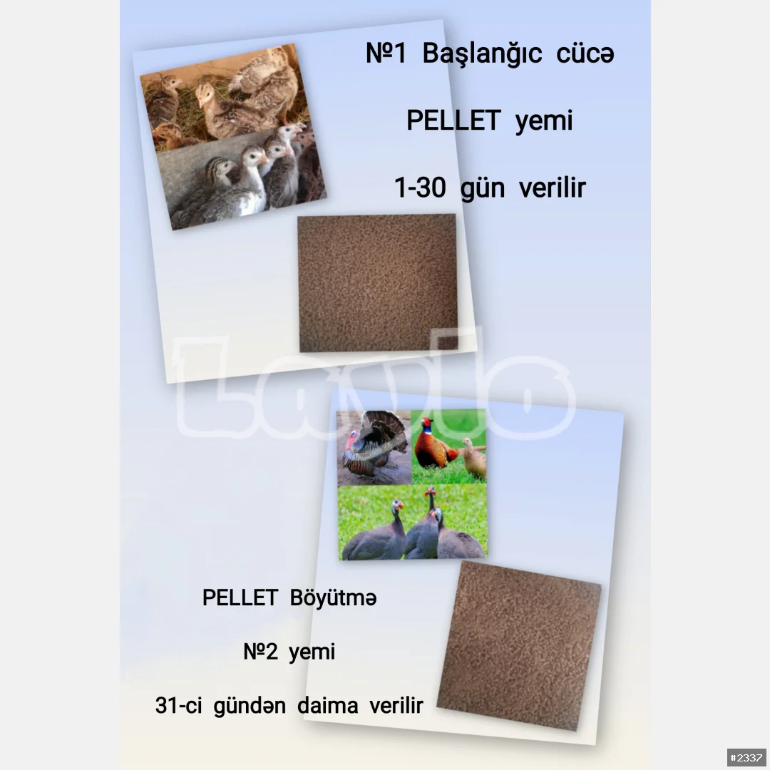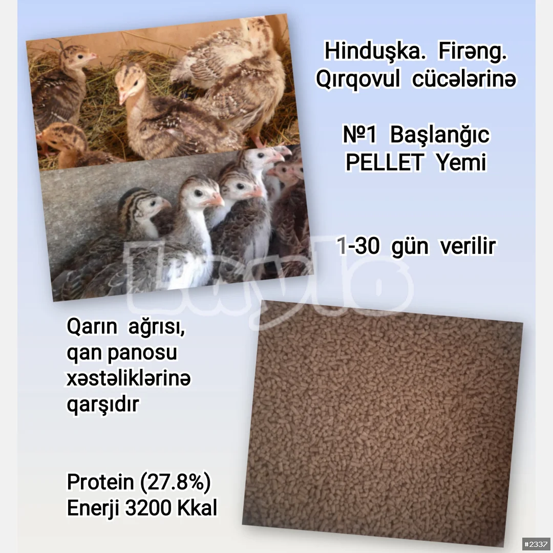 Hinduşka. Firəng. Qırqovul cücələrinə №1 Başlanğıc PELLET Yemi. 1-30 gün verilir. Qarın ağrısı, qan panosu xəstəliklərinə qarşıdır. Əzələ və sümük inkişafı üçün bütün vitamin, mineral və amin turşuları, yağlı toxumlar və jmıxı, taxıl məhsulları, nişasta, kalsium, dikalsium fosfat, duz, enzimlər, kiflənmə əleyhinə antioksidantlardan hazırlanır. Təbiətin seçkin quşlarını sağlam və güclü böyütmək istəyirsinizsə, başlanğıcı düzgün qoyun! Protein (27.8%). Enerji 3200 Kkal. Çatdırılma PULSUZ Kisə ilə = 55 ₼.