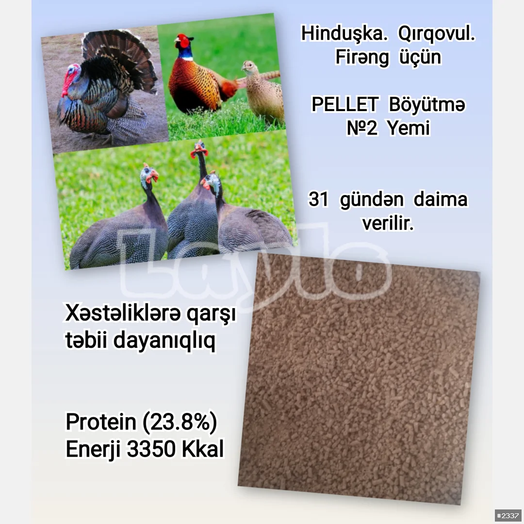 Hinduşka. Qırqovul. Firəng PELLET Böyütmə №2 Yemi. 31-ci gündən daima. Xəstəliklərə qarşı təbii dayanıqlıq. Həzmə uyğunlaşdırılmış formulla, rahat qəbul, effektiv nəticə. Protein (23.8%). Enerji 3350 Kkal olmaqla cücələrin sürətli inkişafının davamı üçün lazımı enerji və aminoturşularla balanslaşdırılıb. Çatdırılma PULSUZ Kisə ilə = 55 ₼.