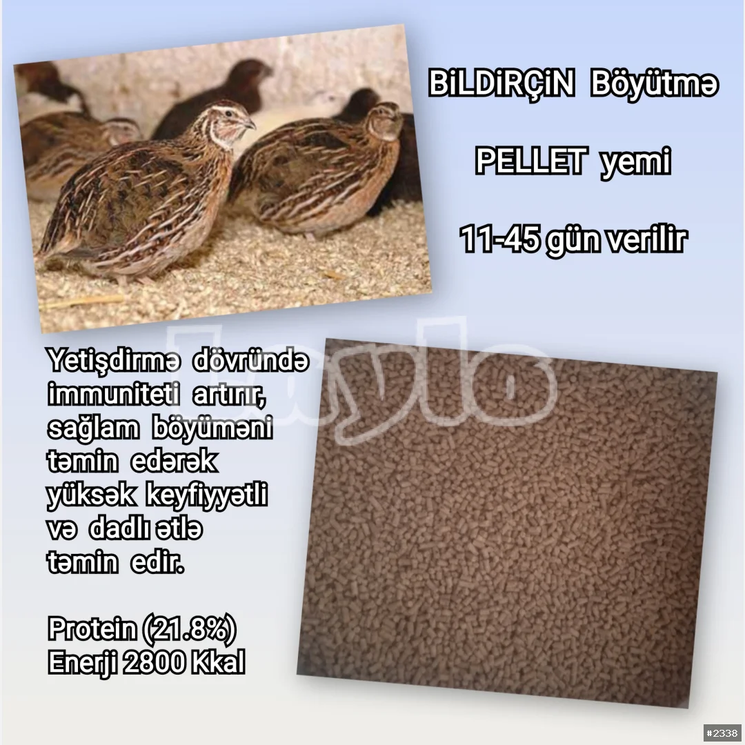 Bildirçin Böyütmə PELLET Yemi 11-45 gün verilir. Yetişdirmə dövründə immuniteti artırır, sağlam böyüməni təmin edərək yüksək keyfiyyətli və dadlı ətlə təmin edir. Dəqiq balanslaşdırılmış protein və enerji miqdarı. Vitamin və mineral dəstəyi, amin turşuları, yağlı toxumlar və jmıxı, taxıl məhsulları, nişasta, kalsium, dikalsium fosfat, duz, enzimlər, kiflənmə əleyhinə antioksidantlardan hazırlanır. Protein (21.8%). Enerji 2800 Kkal. Çatdırılma PULSUZ Kisə ilə = 55 ₼.