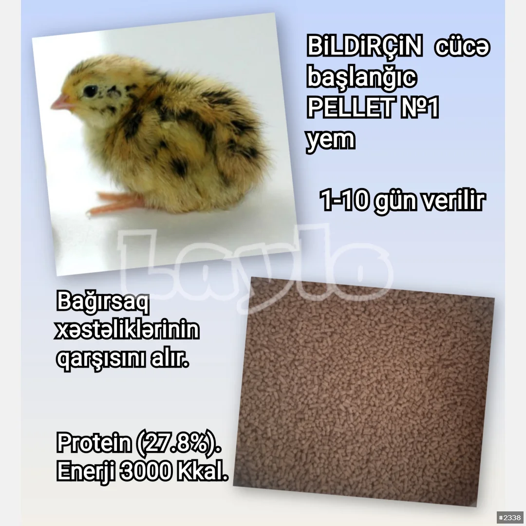 Bildirçin cücələrinə başlanğıc PELLET №1 yemi 1-10 gün verilir. İlk gündən düzgün qidalanma. Bağırsaq xəstəliklərinin qarşısını alır. Yüksək protein tərkibi. Sürətli inkişaf. Təbii vitamin və minerallar. Güclü immunitet və parlaq tüklər. Zərif və asan həzm olunan formula. Yağlı toxumlar və jmıxı, taxıl məhsulları, nişasta, kalsium, dikalsium fosfat, duz, enzimlər, vitamin və mineral premiksləri, böyütmə faktoru. Protein (27.8%). Enerji 3000 Kkal. Çatdırılma PULSUZ Kisə ilə = 55 ₼.