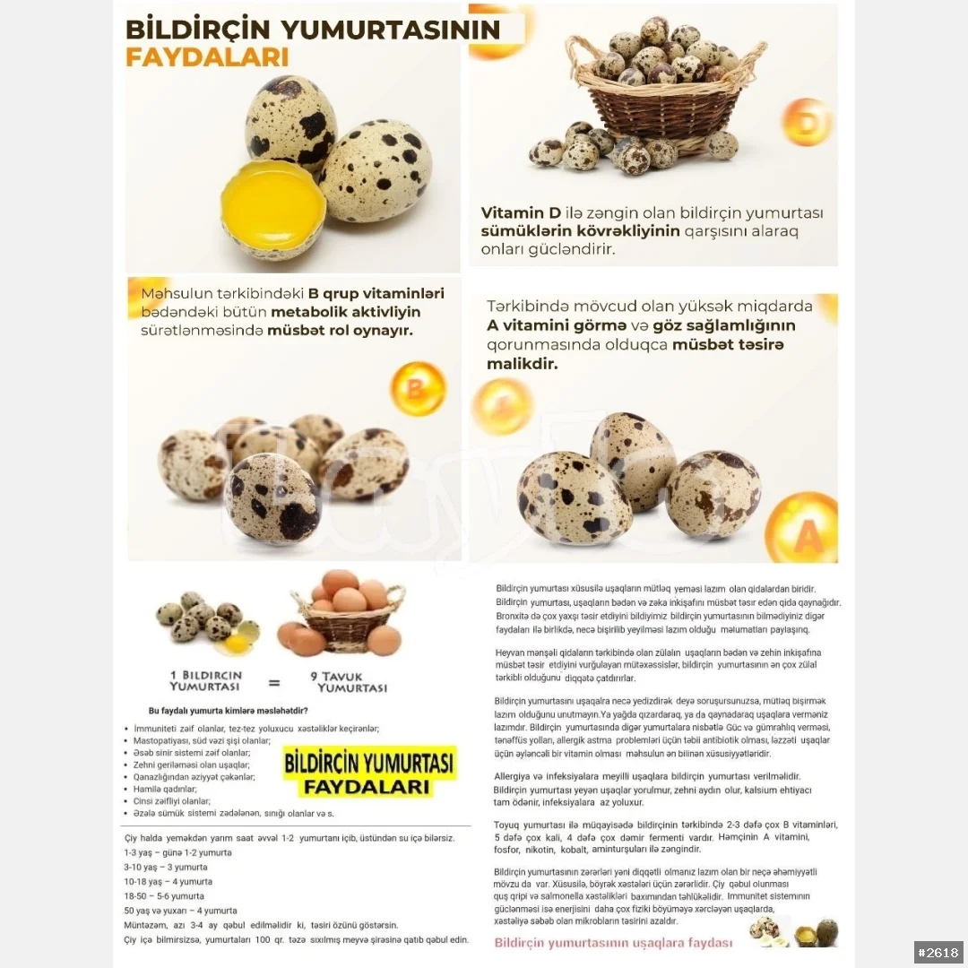 Bildriçin yumurtası. Sən hələ bildirçin yumurtalarına baxıb “Bu balacaların nə gücü olar” deyirsən? Amma səni səhər yeməyindən razı salacaq bu yumurtaların gücü 3 Toyuq yumurtasına “Salam!” deyir! A, B, D Vitamin və Minerallar, zəngin zülal və amin turşuları ilə bədən və zehni inkişafı dəstəkləyir. Uşaqlar, yaşlılar və idmançılar üçün ideal qida. Alergiya riskini azdır, təbii və orqanik məhsul kimi tövsiyə olunur