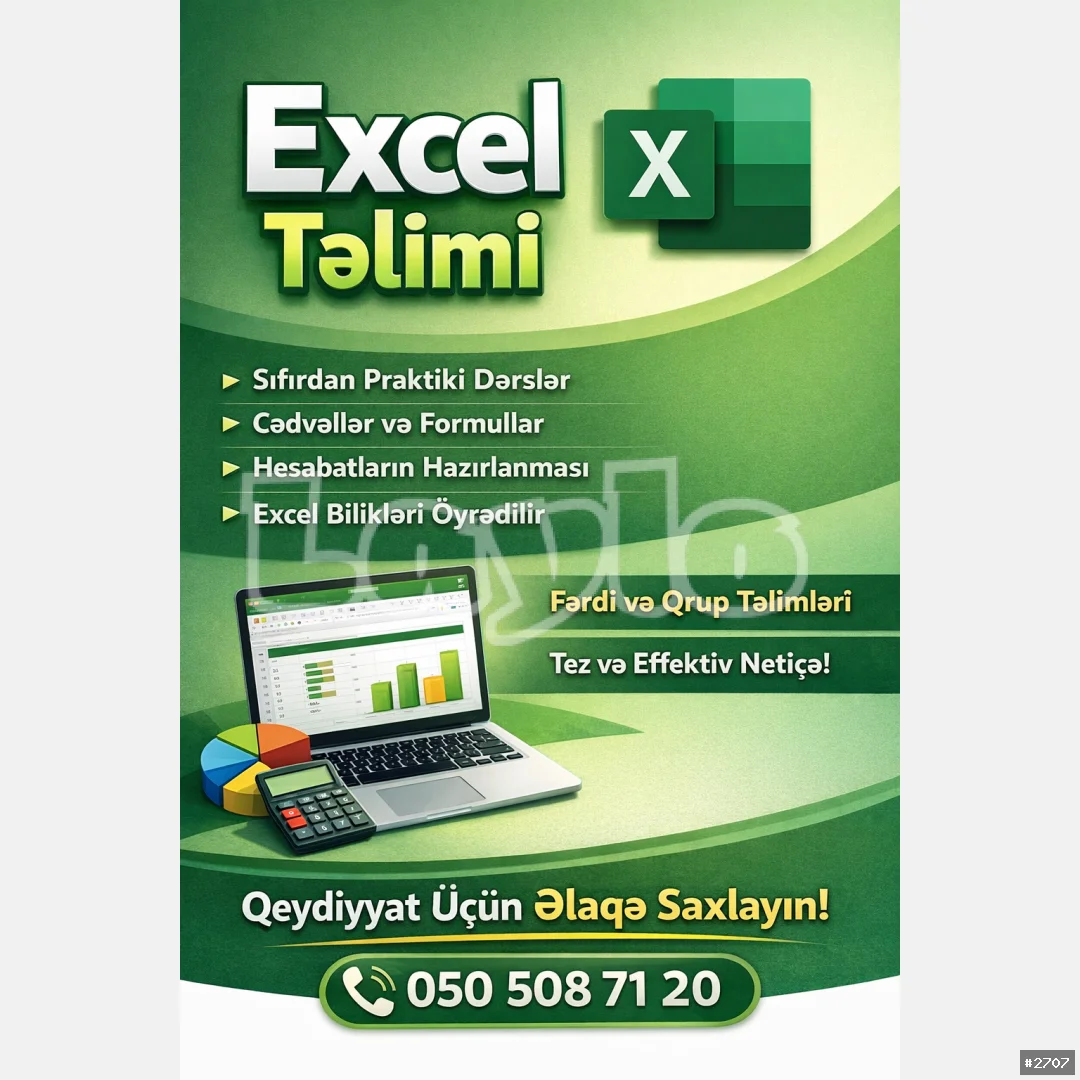 Excel proqramını sıfırdan öyrənmək istəyənlər üçün praktiki dərslər təşkil olunur. Dərslər zamanı cədvəllərin hazırlanması, formulların tətbiqi, hesabatların qurulması və iş üçün vacib olan Excel bilikləri öyrədilir. Təlimlər sadə və anlaşıqlı şəkildə izah olunur.